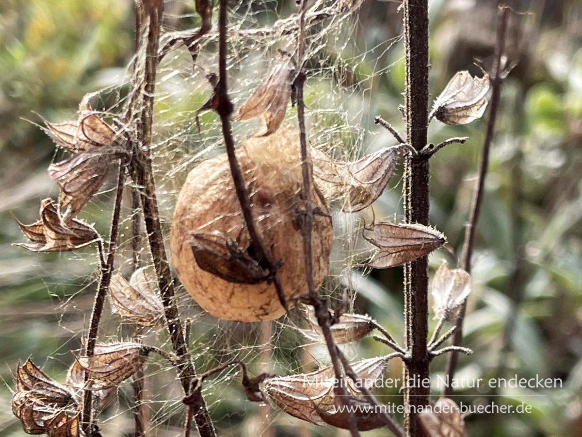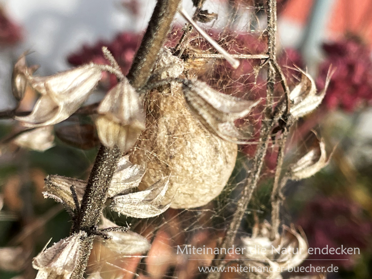 Irgendwo da muss die Wespenspinne den Sommer über gesessen haben. Denn Wespenspinnen spinnen ihre Eikokons ganz in der Nähe ihres Netzes. Auch das unterscheidet sie von der Kreuzspinne. Denn da Kreuzspinnen ihre Netze hoch und frei hängend spinnen, suchen die sich dann einen anderen Platz, wo ihre Kokons besser geschützt sind.