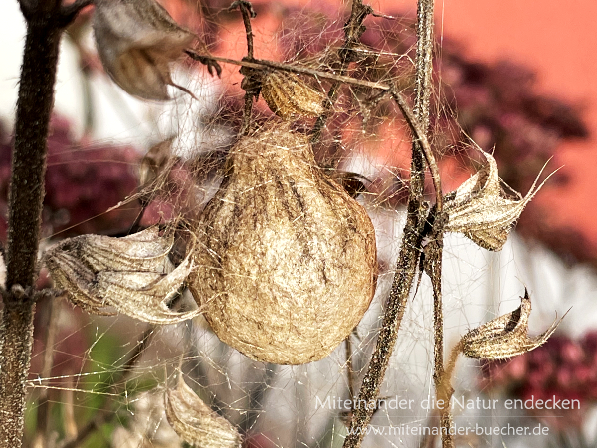 Meine Wespenspinnenbegnung am Insektenvorhang ist inzwischen schon einige Jahre her. Und ich habe immer wieder in meinen zwei Wiesenstücken Ausschau nach Wespenspinnen gehalten. Doch ich habe nie mehr eine gesehen. Gut, dachte ich, dann hatte sich eben mal eine Wespenspinne in unseren Garten verirrt und das war’s. Doch dieses Jahr im Herbst habe ich ein kleines Beutelchen in meinem Garten entdeckt.